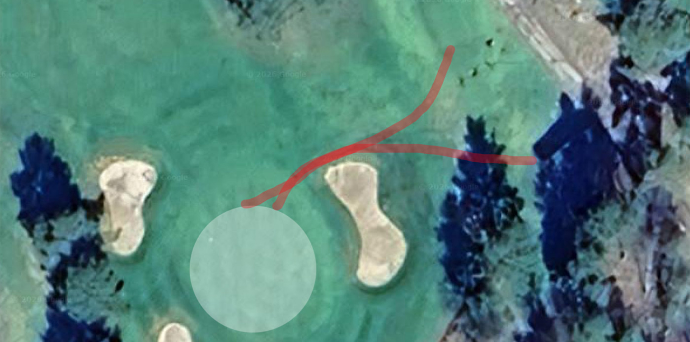 Oavsett var flaggan står så ska man vidare till nästa tee eller kanske förbi kiosken. Det gör att vissa delar av greenen används betydligt mer än andra. Tittar man uppifrån, som på bilden, ser man ganska tydligt hur ett område “borde” bli överrepresenterat. Det ljusare vita området är där flaggan normalt står. Ändå blir det inga stigar.