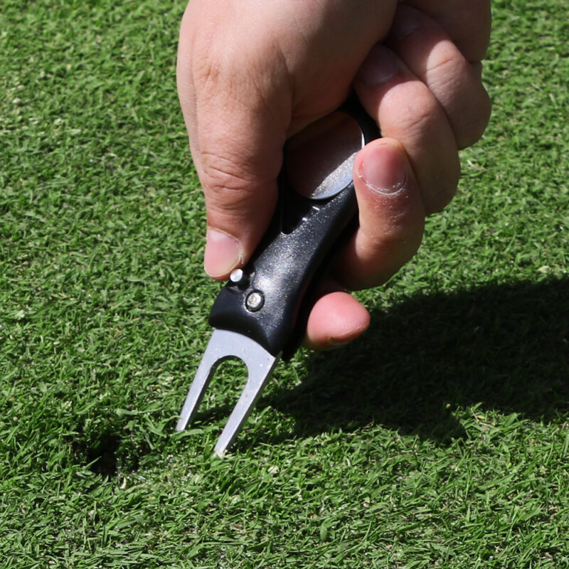 Ett bra sätt att laga märket är att föra in piggarna på greenlagaren i kanten av nedslagsmärket och sedan trycka marken försiktigt inåt mot centrum. Arbeta runt märket från flera håll tills ytan jämnas ut. När märket ser jämnt ut kan du försiktigt släta till ytan med puttern.