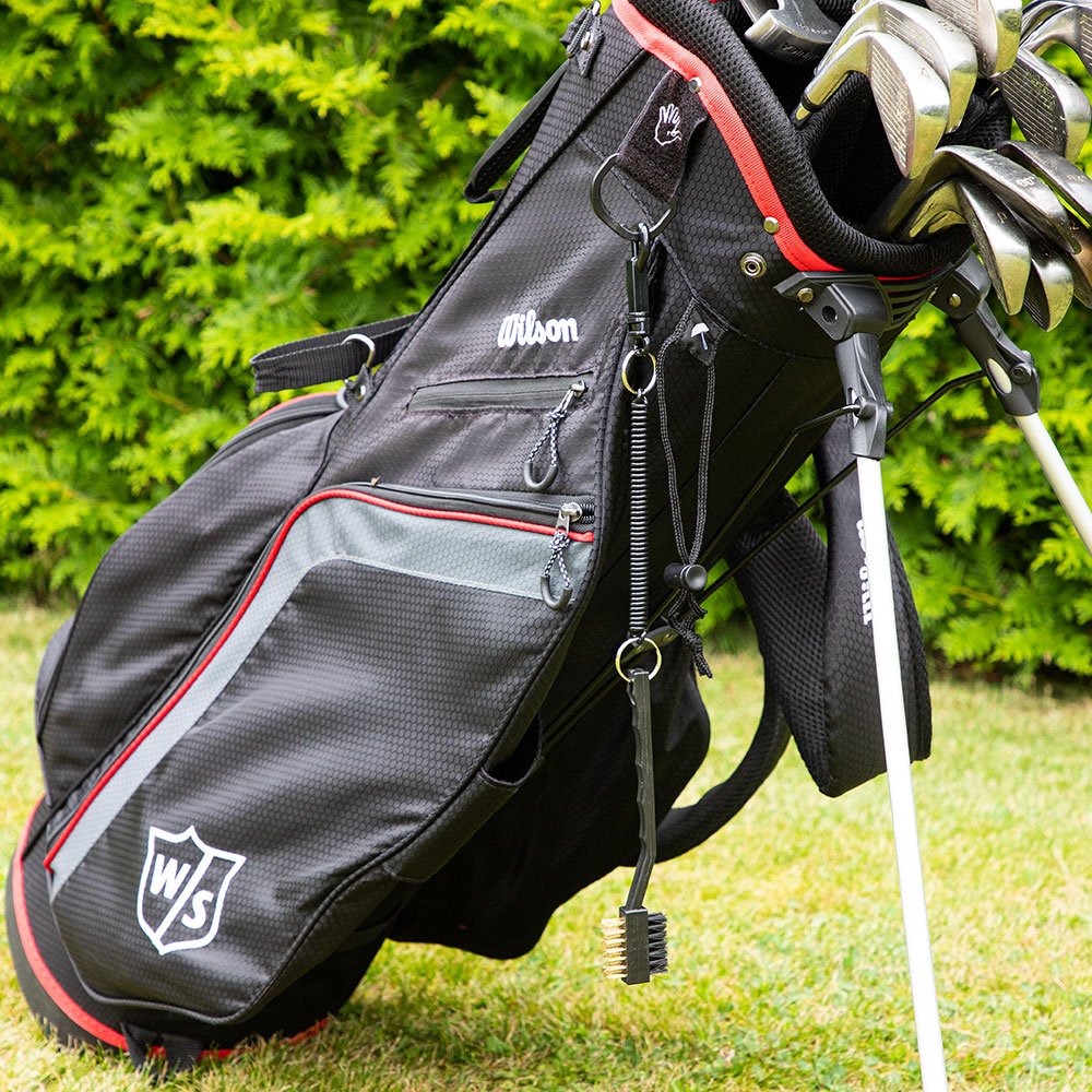 Här har du en rejäl och bra golfborste som du kan använda för att rengöra dina golfklubbor. Borsten har två sidor, en med mjuk borst och en med metallborst, så att du kan få bort all smuts och rengöra den ordenligt. Det finns även ett ordentligt och bra handtag att hålla i så att den blir lättare att använda. Du kan även hänga golfborsten på bagen med hjälp av den smidiga kroken. En elastisk lina gör att du kan dra ut borsten.